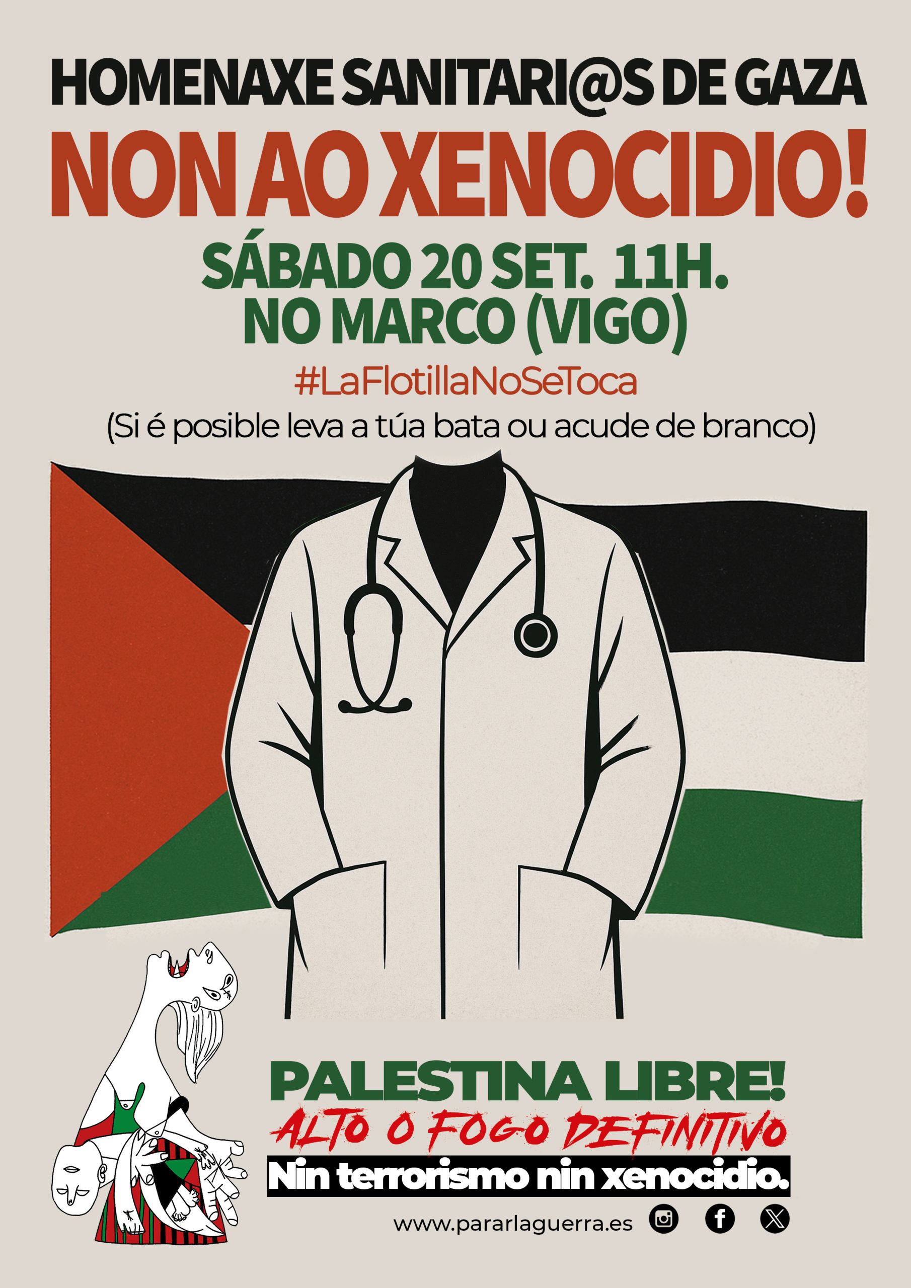 Este sábado 20 de setembro ás 11h diante do MARCO de Vigo realizarase unha homenaxe de apoio aos sanitarios e sanitarias de Gaza e á vez un apoio á flotilla que estes dias está a navegar a Gaza para romper o bloqueo humanitario.