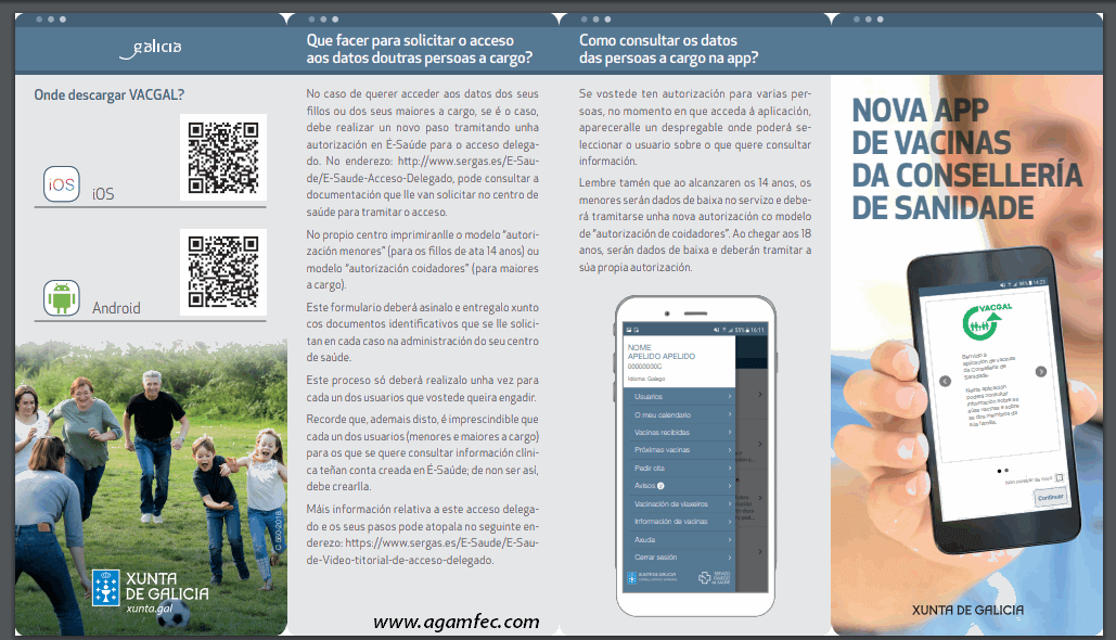 pon a disposición dos cidadáns galegos o seu historial vacinas, así como información sobre os calendarios vacinais, a vacinación en viaxeiros, os recordatorios de vacinas pendentes e a xestión da solicitude de citas para vacinarse... , todo elo dun modo sinxelo e áxil a través do seu dispositivo móbil, smartphone ou tablet.